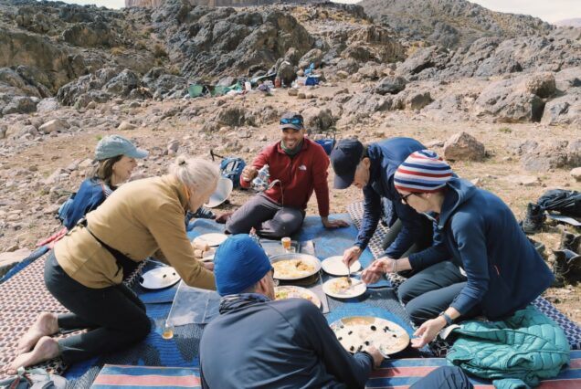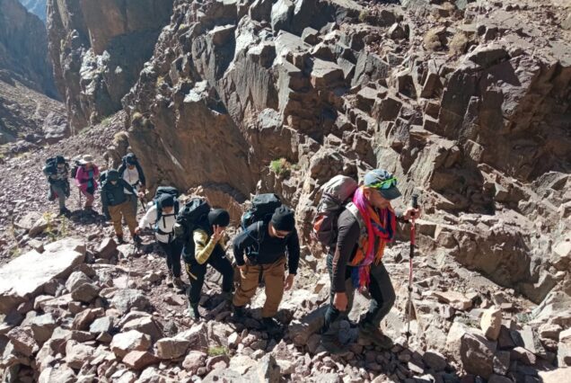 After breakfast, we begin our trek, following the Mizane valley, first towards the village of Aremd, and then to the Sidi Chamarouch sanctuary. Built on a morainic spur overlooking the valley floor, Armd is the largest village in the valley and offers an interesting mix of traditional terraced agriculture, guesthouses, and streets that seem to be permanently blocked by goats and livestock. Continuing east and crossing the floodplain, our itinerary takes us along mule trails and up to the high rocky cliffs above the valley. Crossing the river, we finally arrive at the pastoral sanctuary of Sidi Chamarouch. The village is located next to a small waterfall, a cluster of intertwined houses that seem to blend into a chaotic mass. From there, the trail continues to climb steadily, winding and zigzagging up to the snow line and the Toubkal refuge (3206m), our overnight stop.
