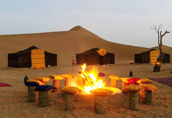 Early morning sunrise, after breakfast, camel ride in the middle of the large dunes. Overnight stay in an auberge.